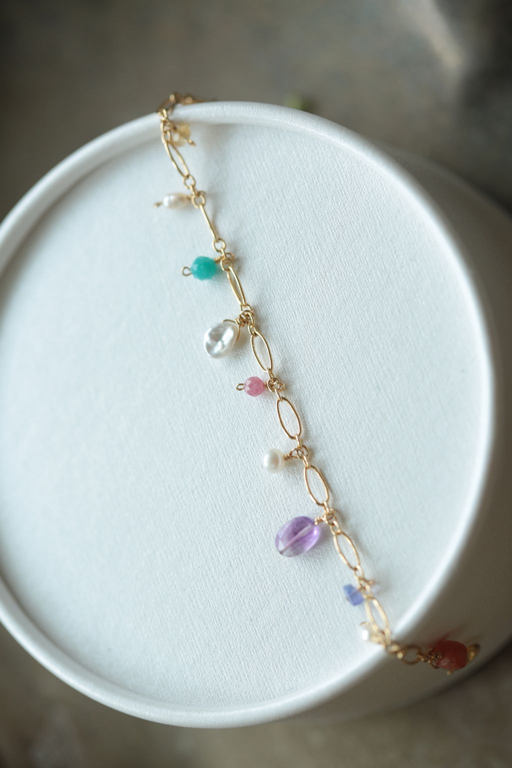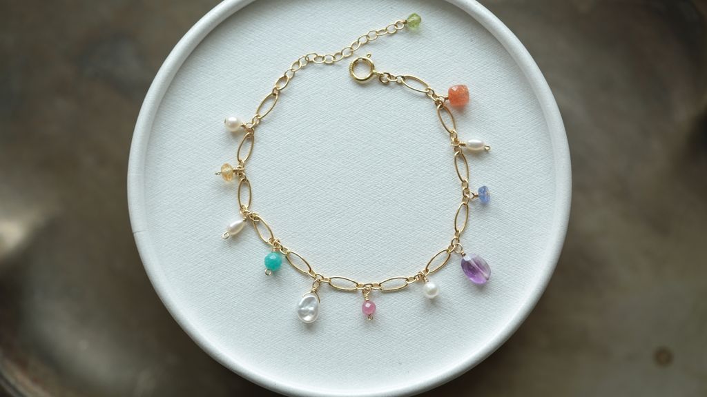 本產品包含太陽石/珍珠/坦桑石/紫水晶/粉碧璽/天河石/黃水晶/橄欖石(延長鍊尾)
